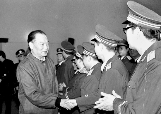 1989年1月,时任国务委员兼公安部部长、武警部队第一政委的王芳同志(前左一)出席武警部队校官以上警官授衔仪式并接见被授衔警官。