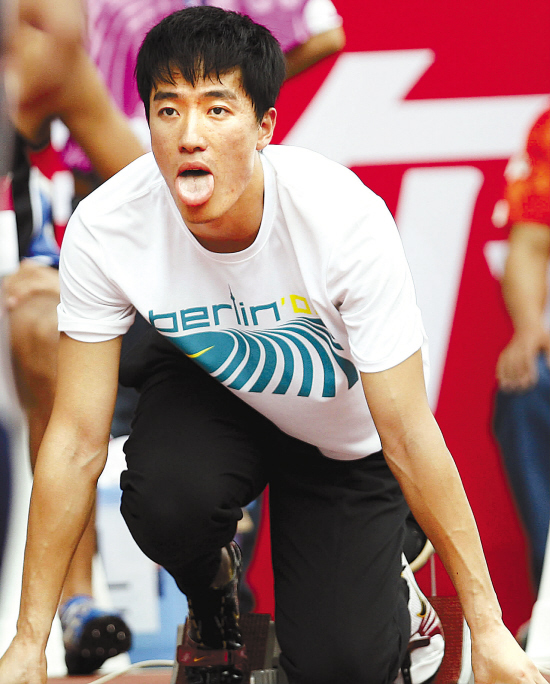 刘翔赛前的招牌动作。 新华社记者 廖宇杰 摄
