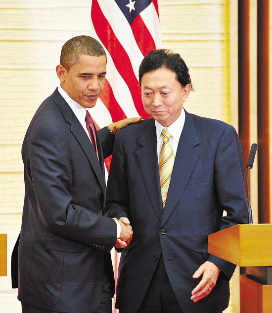 图为11月13日,美国总统奥巴马(左)与日本首相鸠山由纪夫在日本东京首相官邸出席记者招待会。 新华社发