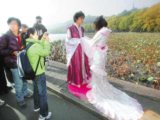 昨天下午,来自中国美术学院社团联合会的20多名大学生,在断桥上展示行为艺术。学生们演绎白娘子与许仙凄美执着的爱情故事,吸引了许多游客观看。