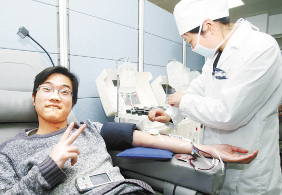 昨日,在省血液中心,来自浙江教育学院的甲流康复者余罗云正在献血。 本报记者 梁臻 摄