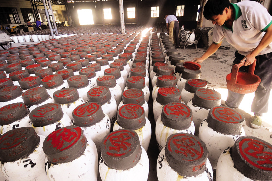 11月7日,绍兴酿酒工人正在为第一批黄酒的封泥上印上红色的“绍”字。徐昱 摄