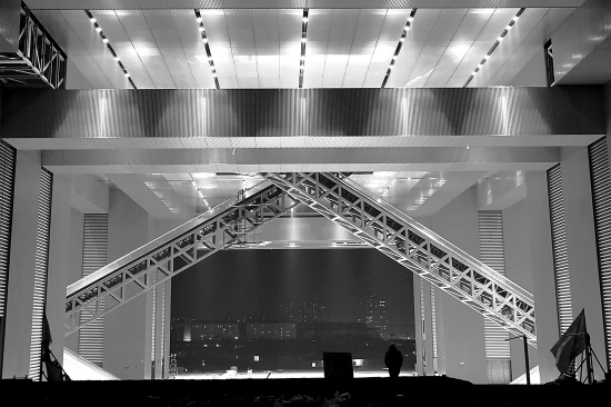 11月17日傍晚,上海世博园区中国馆的馆内大厅在试灯。目前,世博园区中国馆已开始进行馆内灯光调试。 新华社发