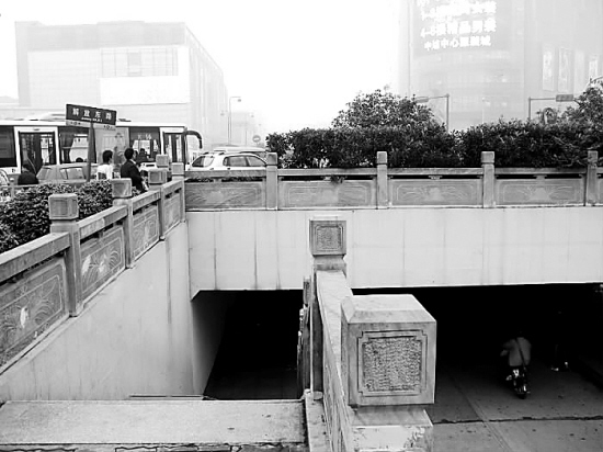 ← 已建双车道的地下通道,两侧还各有人行通道。通道上方的解放东路上,又划上了同一方向的人行横道线。原本走地下通道的车辆和行人纷纷改走更加便捷的人行横道,地下通道流量稀少,而地面上的交通却常常拥堵不堪。