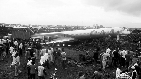 11月19日,在刚果(金)东部城市戈马,人们聚集在发生事故的飞机旁。当日,这架客机在戈马机场着陆时因刹闸失灵冲出跑道,造成约10名乘客受轻伤。