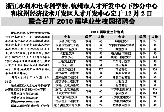 浙江水利水电专科学校位于杭州下沙高教园区,是一所培养面向水利水电行业和浙江区域经济发展需要的高等应用型专业技术人才的工科院校。2010年学校有32个专业,共3062名本、专科毕业生。学校将于2009年12月2日(周三)举办“2010届毕业生校园招聘会”,热忱欢迎广大用人单位届时来我校招贤纳才!同时,也欢迎用人单位来我校举办专场招聘会。