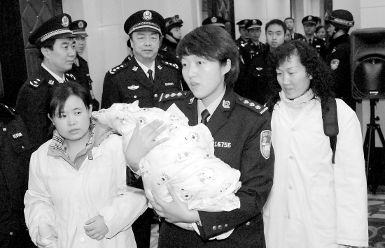 12月1日,在西安咸阳国际机场,民警抱着被解救的婴儿。新华社发