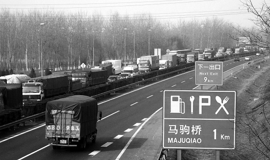 这是12月1日中午京津塘高速公路马驹桥路段的拥堵情况。当日,我国华北地区依然大雾,多条高速公路出现拥堵情况。 新华社发
