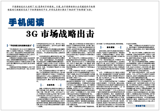 同时,3G网络的全面铺开给了中国移动发展手机阅读的一个先天优势,就是互动性。中国移动推出的手机阅读平台能够有效地实现对内容的“即时评论”和“内容推广”,这一功能将成为移动手机阅读业务的杀手锏。