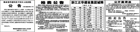 受委托,并经甬土资拍[2009]165号文件核准,本公司将于 2009年12月18日上午10时整在宁波市江东北路138号金融大厦18楼会议室公开拍卖位于宁波市海曙区镇明路36号中信银行大厦第二十、二十一、二十二层房地产。房产总建筑面积4245.66m2,土地使用权总面积 2062.14m2,国有出让办公用地。参考价:人民币6692.1万元,保证金:人民币700万元。