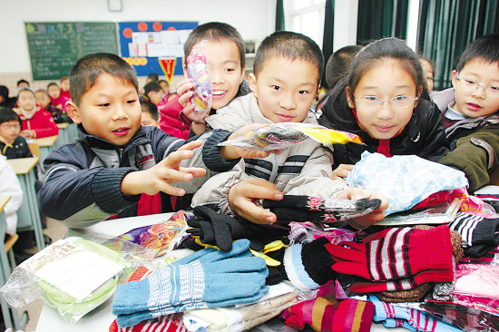 昨天,湖州市爱山小学学生向四川地震灾区结对学校马鹿小学捐赠手套。寒冬来临,湖州许多中小学纷纷开展“情系灾区寒冬暖手”爱心活动。