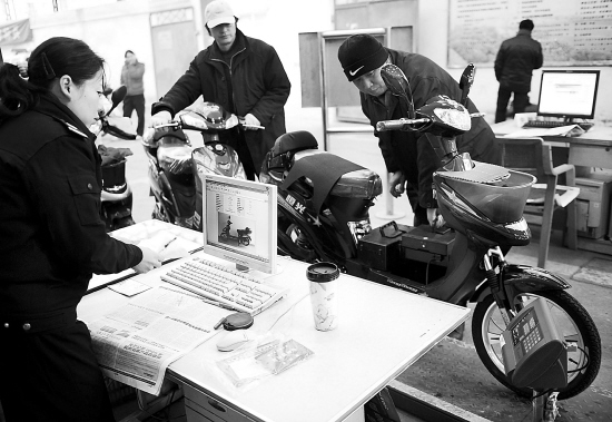 昨日,杭州市公安局非机动车管理所工作人员正在为电动自行车进行检测,车速不大于20km/ h、整车质量不大于50kg、额定电压不大于36V的车辆,才可以在杭州上牌上路行驶。本报记者 梁臻 摄