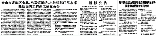 3.投标文件递交截止时间:马岙镇团结水库2009年1月6日上午9时30分,金林水库2009年1月6日上午10时,小沙镇昌门里水库2009年1月7日上午9时30分。