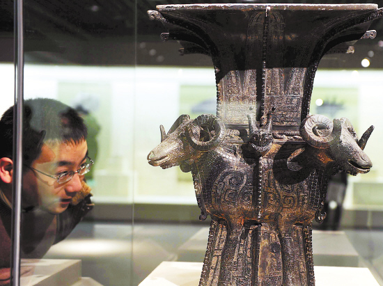 | 12月22日,一位市民正在仔细观看湖南出土的商后期青铜器“四羊方尊”。当日,中国国家博物馆“国家宝藏”全国巡回展在浙江博物馆武林展区展出,80件(组)文物是国博从60余万件藏品中精选的珍贵文物,是名副其实的“国家宝藏”。 本报记者 梁臻 摄 |
