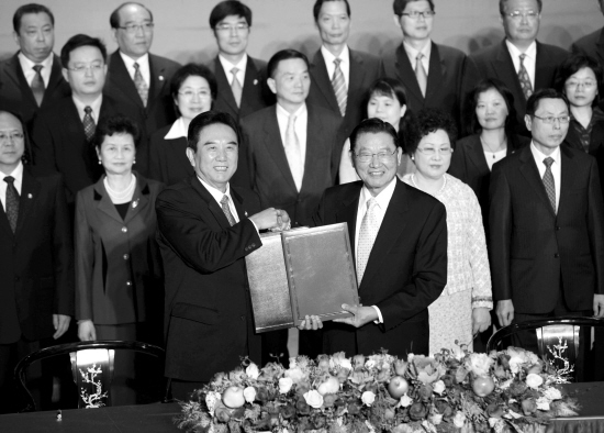 | 12月22日,海协会会长陈云林与海基会董事长江丙坤在台中签署两岸渔船船员劳务合作、两岸农产品检疫检验合作、两岸标准计量检验认证合作等三项协议。图为海协会会长陈云林(前左)与海基会董事长江丙坤在交换协议。 新华社发 |