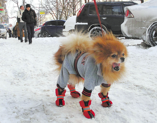 12月21日,在乌克兰首都基辅,一只“全副武装”的小狗走在雪地上。新华社发