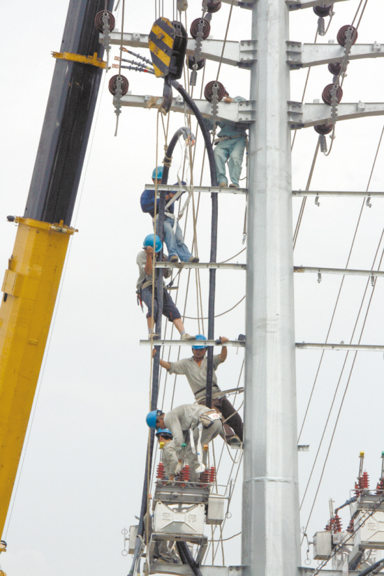 | 2009年,松阳供电局投入3990万元用于电网建设。220千伏北山输变电工程、35千伏赤寿输变电工程等一大批电力工程开工,35千伏叶村输变电工程投产,进一步优化了松阳县电网结构,供电质量、供电能力显著增强,促进了松阳县经济的全面发展。图为35千伏延叶线施工现场。通讯员 宋恩亮 卞建萍/摄 |