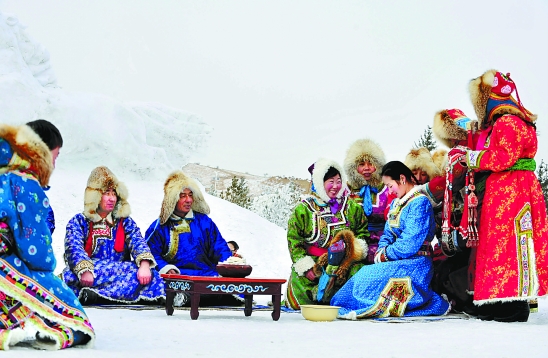 | 12月28日,2009银色乌珠穆沁草原冰雪嘉年华活动在内蒙古西乌珠穆沁旗盛装开幕,赛马、射箭、赛骆驼等丰富多彩的民俗活动让参与者尽情领略冬季草原独特的冰雪魅力和蒙古族古朴、淳厚的文化和民俗。图为蒙古族群众正在为来宾展示乌珠穆沁婚礼。 新华社发 |