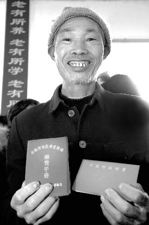 | 余姚市梁弄镇东溪村67岁的农民姚振国,领到了存有养老金的存折。 新华社发 |