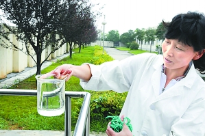 | 衢州市污水处理厂的一名工作人员展示已经完成污水处理净化、准备出厂的水。 |