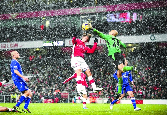 1月9日,阿森纳队队员罗西基(中)与埃弗顿队门将霍华德拼抢。当日,阿森纳队在英超联赛第21轮比赛中主场以2比2战平埃弗顿队。新华社发