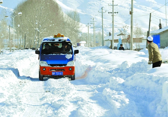 | 自1月6日开始,新疆北部遭受了有气象记录以来罕见的大雪,大雪造成阿勒泰地区通往乌鲁木齐和部分县市的公路阻断,阿勒泰地区富蕴、青河等县通往各乡镇的道路也全部瘫痪,当地紧急调动各种铲雪机械昼夜清雪疏通道路。到1月9日中午,阿勒泰地区通往各地及6县1市通往各乡镇的道路已经全部打通,各地的部分乡村道路正在加紧疏通之中。图为1月9日,出租汽车开进大雪后的新疆阿勒泰地区青河县阿热勒乡。新华社发 |