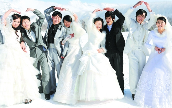 1月12日,拍摄“雪地婚纱照”的新人集体合影。当日,“白头到老”长白山雪地婚纱摄影节在长白山池西区举行,20对新人在冰天雪地中用镜头记录幸福的瞬间。 新华社发