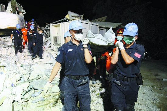 1月16日,在海地太子港,中国维和警察防暴队队员在联合国驻海地稳定特派团倒塌大楼现场抬出一具中方失踪人员遗体。