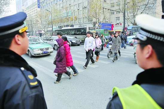 杭州昨起开展集中整治行动,严管重罚出租车在斑马线上的不礼让行为。本次整治行动将历时1个月。图为交警和运管人员在体育场路执法。