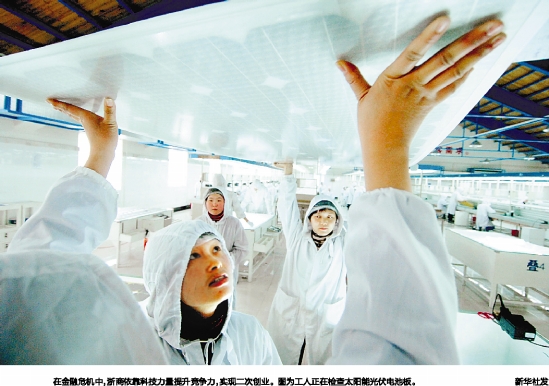 在金融危机中,浙商依靠科技力量提升竞争力,实现二次创业。图为工人正在检查太阳能光伏电池板。新华社发