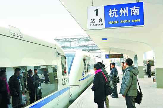 1月20日清晨,位于萧山的杭州火车南站正式启用。图为旅客们在火车南站新站台准备上车。