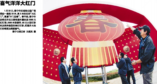 | 1月20日,海宁市区城南公园广场竖起一扇宽20米、高8米的巨形“大红门”,寓意“开门迎春”。春节前,海宁市还将在市区主要街道布置安放2000只红灯笼、2600米彩旗带、60只大型灯彩柱及各种造型的硖石灯彩,把潮乡大地打扮得更加美丽喜气。 海宁日报记者 王超英 摄 |