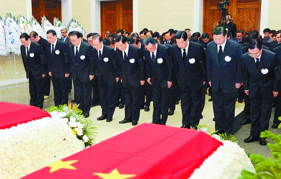| 1月20日上午,胡锦涛、吴邦国、温家宝、贾庆林、李长春、习近平、李克强、贺国强、周永康等党和国家领导人来到北京八宝山革命公墓礼堂,同首都各界群众一道,深情送别在海地地震中不幸遇难的8位中国维和警察。新华社发 (详见第五版) |