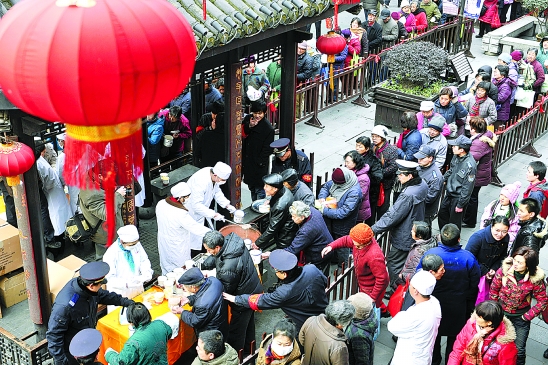 1月22日,杭州河坊街上的百年老字号方回春堂举办腊八施粥节,市民们一大早排起了两条400多米长的队伍,当天发放了一万碗腊八粥。据了解,方回春堂的腊八粥由糯米、红枣、桂圆、茯苓、木糖醇等17味食材组成。 记者 吴元峰 摄