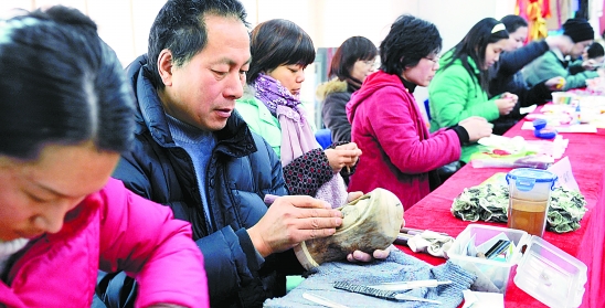 困难群众正在阳光工艺大舞台创业园制作工艺品。本报记者 黄曙林 摄