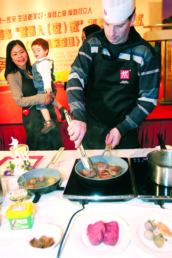 1月21日,来自加拿大的凯麦龙携妻儿当场烹制“私房菜”。当日,上海启动“世博人(农)家”招募活动。来自上海各社区的200余个家庭在启动仪式上各展厨艺,争做“世博人(农)家”。 新华社发