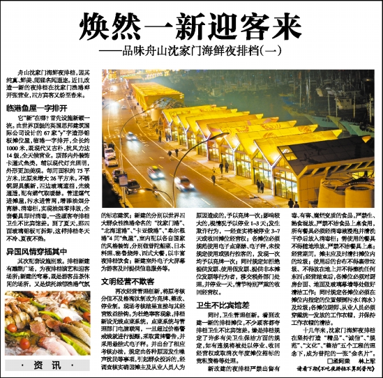 十几年来,沈家门海鲜夜排档在坚持打造“精品”、“诚信”、“规范”、“文化”、“整洁”五个工程的理念下,成为普陀的一张“金名片”。□孟阿荣 林上军