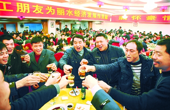 1月25日,丽水市总工会、经济开发区管委会和企业请民工吃年夜饭。这些民工来自四川、湖北等10多个省市,他们与企业共同努力,度过了金融危机。朱丽勇 摄