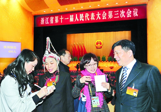 1月26日上午,省十一届人大三次会议开幕前,记者们抓紧采访。 本报记者 黄曙林 钟昊 摄