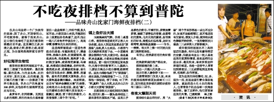 在夜排档天天能吃到活的■类鱼、活的虾、蟹……源头是排档边上就有著名的国际水产城,这里几乎是彩色的街市:千摊百担,箩筐挨着箩筐,装满了翡翠似的青蟹,金黄橙红的黄鱼,乌光闪亮的紫菜,晶莹淡红的虾米,海蜇头红似玛瑙,龙虾玉钩弯弯,鲳鱼银盘滚滚……一车车、一筐筐,每天早上第一时间流向沈家门海鲜夜排挡。