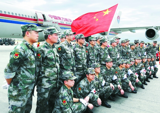 1月25日,中国医疗防疫救护队成员在抵达海地首都太子港后在机场合影。 新华社发