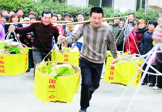 | 1月25日,奉化市溪口镇举办“新溪口、新形象”农村干部文化节活动,来自55个村的百余名村干部参加了“运筹帷幄”中国象棋比赛、“明确目标”投篮比赛等10项活动。图为村干部们正在比拼“敢挑重担”。记者 吴晓鹏 通讯员 吴培维 卓建青 摄 |