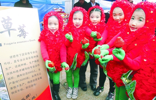 1月30日,扮成草莓样子的草莓娃娃正在展示不同大小和品种的草莓。临近春节,建德市2万多亩草莓陆续上市,市里还组织包括草莓娃娃迎新年、草莓之乡自驾游等活动。 记者 钟昊 李月红 报道组 欧阳文华 摄