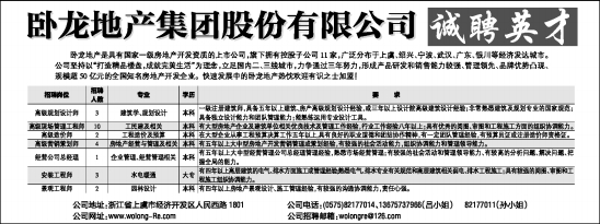 卧龙地产是具有国家一级房地产开发资质的上市公司,旗下拥有控股子公司11家,广泛分布于上虞、绍兴、宁波、武汉、广东、银川等经济发达城市。公司坚持以“打造精品楼盘,成就完美生活”为理念,立足国内二、三线城市,力争通过三年努力,形成产品研发和销售能力较强、管理领先、品牌优势凸现、规模超50亿元的全国知名房地产开发企业。快速发展中的卧龙地产热忱欢迎有识之士加盟!