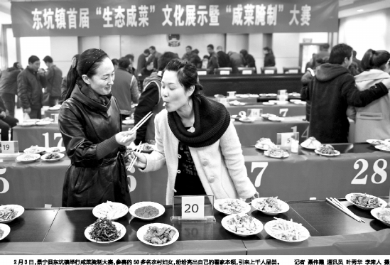 2月3日,景宁县东坑镇举行咸菜腌制大赛,参赛的50多名农村妇女,纷纷亮出自己的看家本领,引来上千人品尝。 记者 聂伟霞 通讯员 叶秀华 李肃人 摄