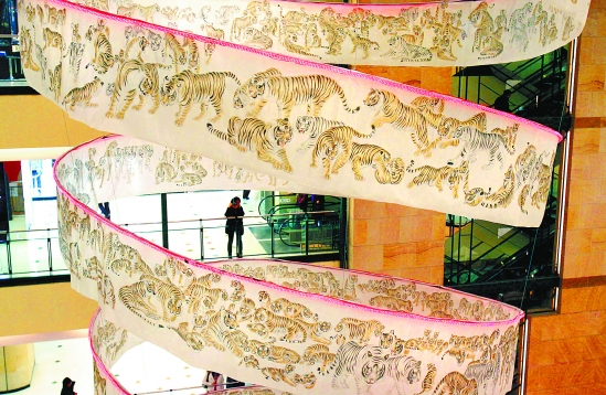 | 2月3日,一幅长达200米的“2010千虎画卷”亮相上海梅龙镇广场,喜迎农历虎年春节和中国2010年上海世博会。这幅画卷共有2010只老虎,由画虎名家肖彦卿等用中国水墨画技法耗时3个月手绘而成。画卷展览结束后将捐赠给上海世博会公众参与馆。图为悬空旋转展示的“2010千虎画卷”。新华社发 |