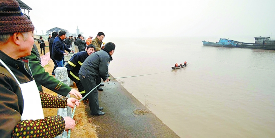 | 昨日7时多,钱塘江海宁盐官段, 5名船工站在两条搁浅的渔船上喊救命,而船锚已被江水冲走。接到报警后,海宁观潮派出所等立即组织施救,通过拉绳子放小船的方法,不断往返进行救援。10时左右,5名船工全部被救起。海宁日报记者 王超英 朱利芳 摄 |