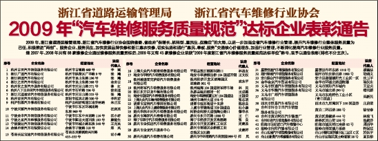 继2007年、2008年共有88家维修企业通过维修服务质量贯标后,2009年又有45家维修企业荣获“2009年度浙江省汽车维修服务质量规范达标单位”称号,现予以通告表彰(排名不分主次)。