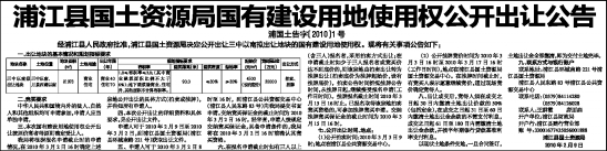 (2)公开挂牌竞价时间为2010年3月3日16时至2010年3月17日16时(工作日时间),地点在浦江县国土资源局国土资源交易中心。在挂牌时间截止时,有竞买人表示愿意继续竞价,通过现场竞价确定竞得人。