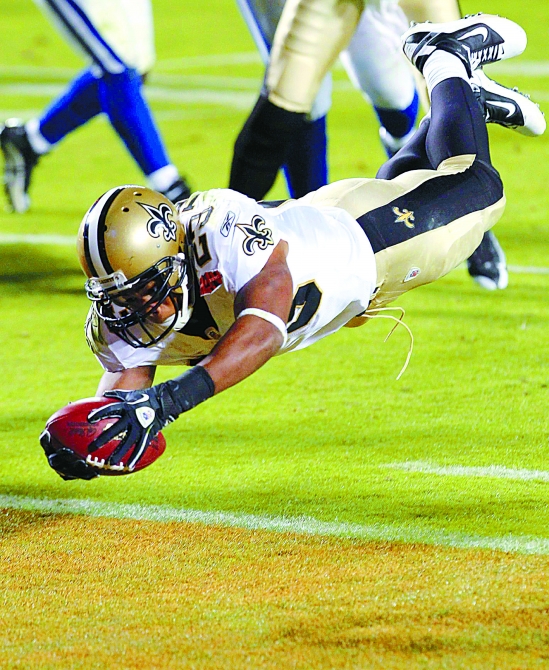2月7日,圣徒队球员托马斯达阵得分。当日,在NFL美国职业橄榄球超级碗总决赛中,新奥尔良圣徒队以31比17战胜印第安纳波利斯小马队,夺得冠军。 新华社发